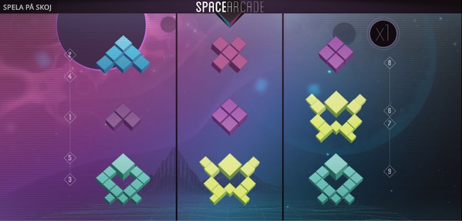 I kategorin enkla och avskalade videoslots har vi en ny vinnare. I Space Arcade är minimalismen allenarådande och all grafik känns klinisk på något sätt. Temat är något oklart, men det är tydligt – precis som titeln skvallrar om – att en slags retrobild av rymden är i centrum. Bakom hjulen skymtar till exempel ett par himlakroppar. I den nedre delen av skärmen finns berg och slätter i vektorgrafik. Uppsättningen symboler inkluderar sex stycken vanliga betalande ikoner och en högbetalande ikon som också dubblerar som wild. De har form som lite mer invecklade Tetris-bitar – ju mer invecklade, desto mer betalar de. Bakgrundsmusiken matchar det avskalade temat och tankarna går osökt till Starburst och NRVNA från Net Entertainment. Det är inte många beats per minut i grundspelet, men när specialfunktionerna sätter igång blir det lite mer skjuts på musiken.